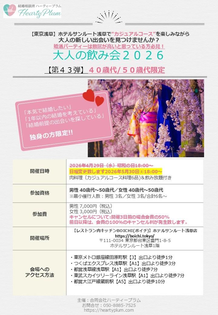 ハーティープラム主催大人の飲み会2026【第43弾】延期:2026/5/30㈯開催