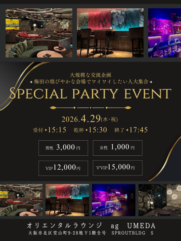 4/29(水・祝)150名大阪/梅田Special Party Event【大規模交流企画】@オリエンタルラウンジ梅田の招待状【梅田の煌びやかな会場でワイワイしたい人大集合】最安値1000円キャンペーンでお得に楽し